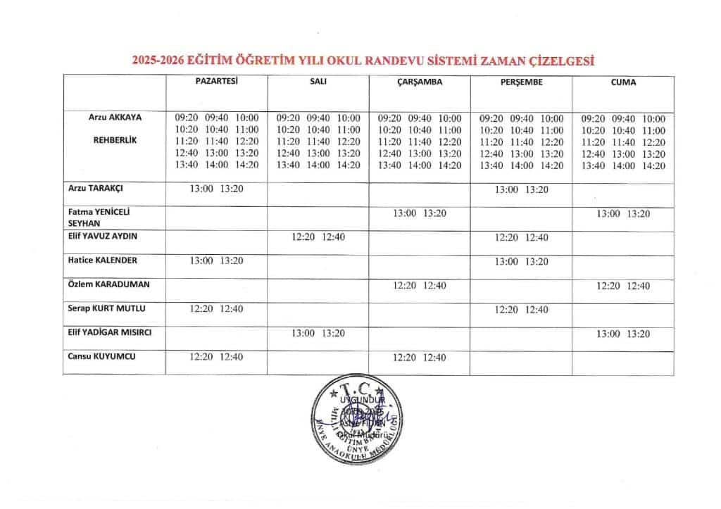 Belirtilen çizelgeye uygun randevu almak için ÜNYE ANAOKULU VELİ RANDEVU SİSTEMİ'ni kullanabilirsiniz